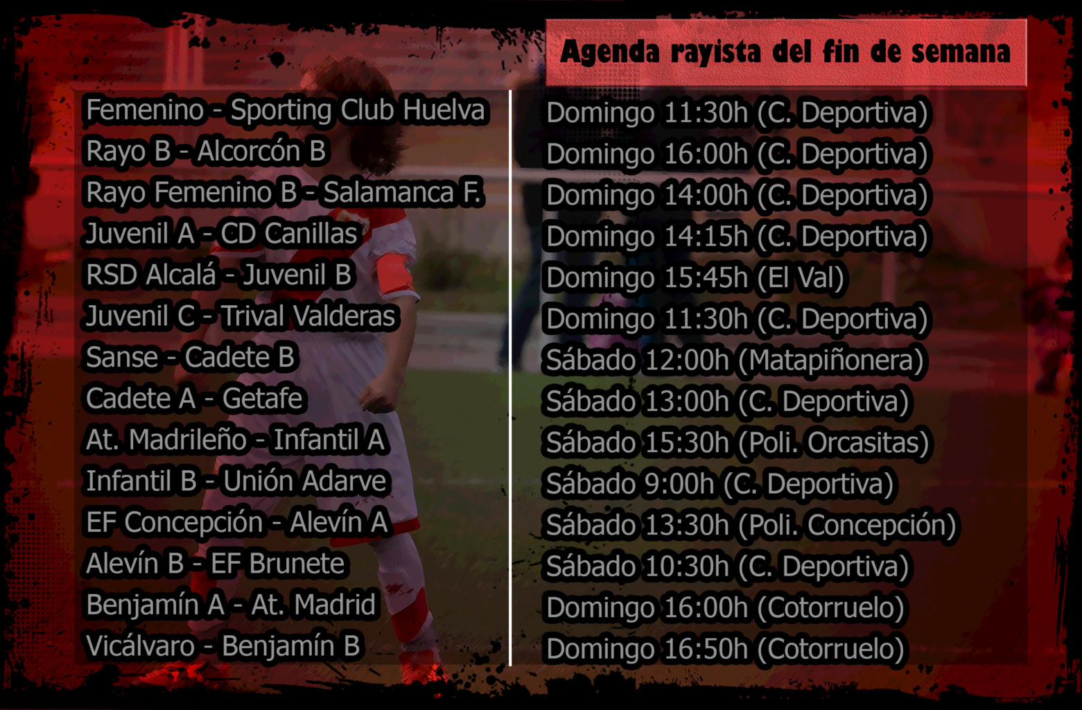 En Unión Rayo repasamos los horarios en los que se van a disputar los partidos de los distintos equipos del Rayo Vallecano en el fin de semana del 24-25 de noviembre.