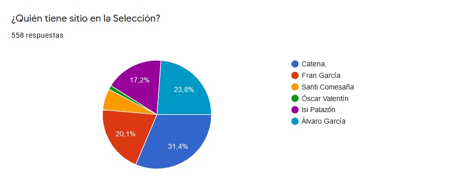 Por otro lado, preguntados sobre que jugador tiene sitio en la Selección; Alejandro Catena fue el futbolista más votado con un 31,4%. Le siguen Álvaro García (23,8%), Fran García (20,1%) e Isi Palazón (17,2%).