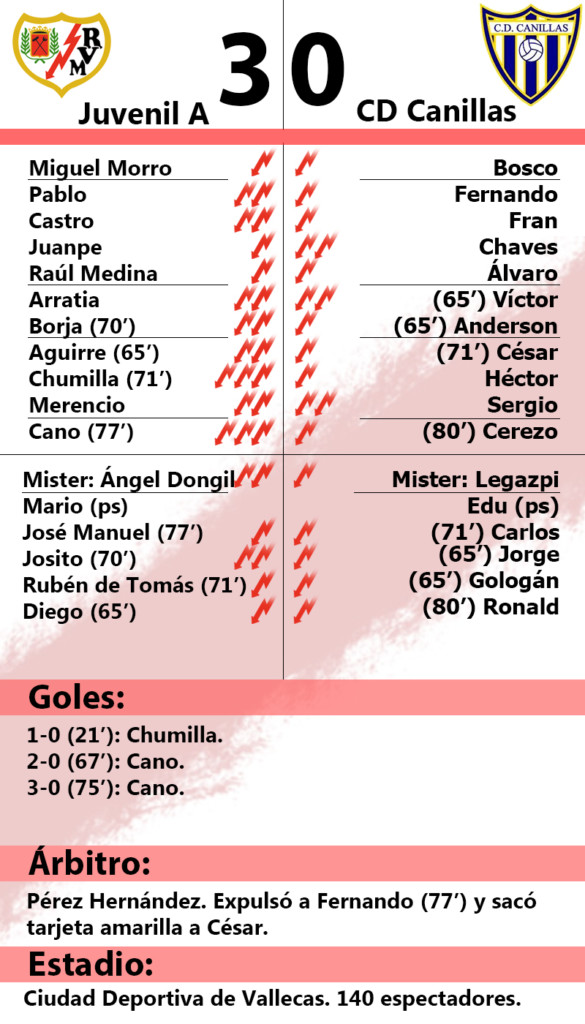 Cuando juegas un partido el domingo, conociendo que uno de tus rivales directos se ha dejado dos puntos, la única cosa en la que piensas es en ganar para recortarlos. Y con esa mentalidad salió al campo el equipo de Ángel Dongil frente al Canillas, consiguiendo una victoria gracias al gol de Chumilla y el doblete de Cano que les mantiene en la tercera posición con 31 puntos, detrás del Real Madrid (32 ptos.) y Atlético de Madrid (35 ptos).