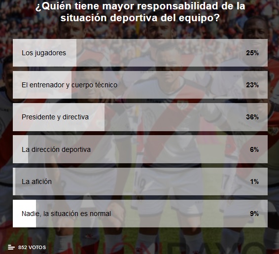 Tras una encuesta con más de 800 votos, el presidente Raúl Martín Presa y su directiva encabezan el mayor porcentaje de ‘culpa’ con un 36% de responsabilidad. Le siguen los jugadores quienes con un 25% de los votos serían los máximos ‘culpables’.