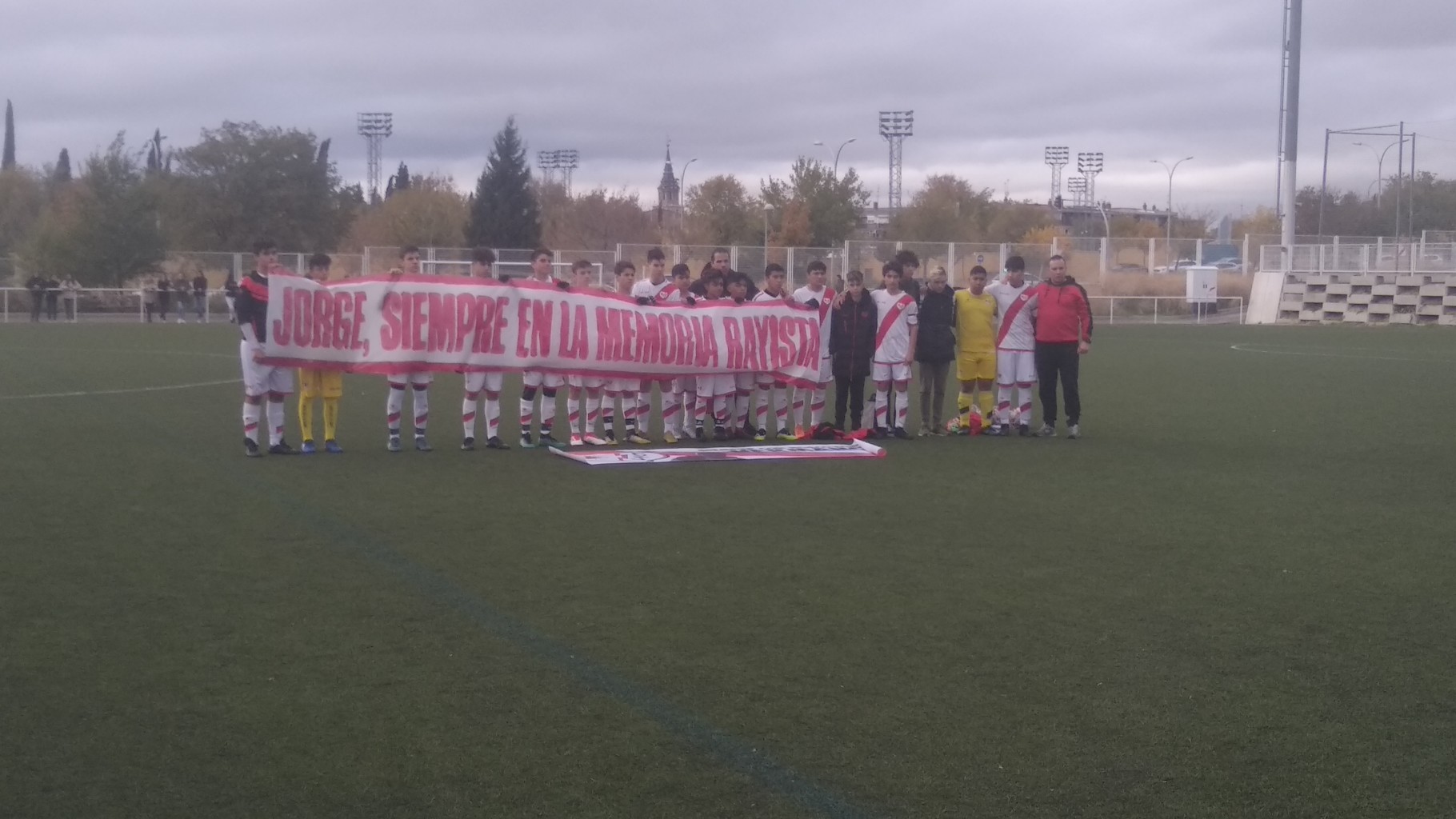 Tanto los cadetes del Rayo como los jugadores de la AD Esperanza saltaron al césped portando dos pancartas en las que se homenajeaba a Jorge: “Jorge siempre en la memoria rayista” y “Siempre con nosotros hermano”.