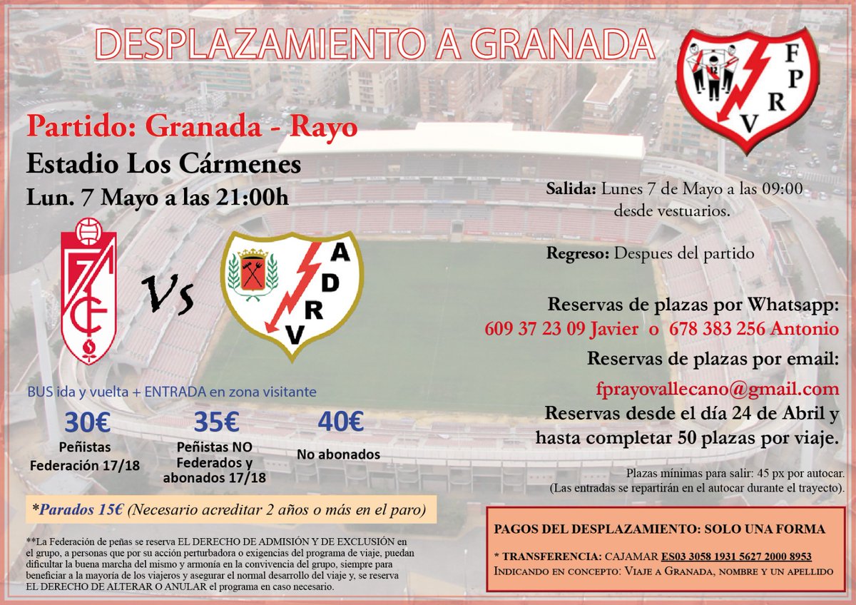 La Federación de Peñas del Rayo Vallecano ha lanzado el desplazamiento para el encuentro del partido en el estadio de Los Cármenes ante el Granada el próximo 7 de mayo.