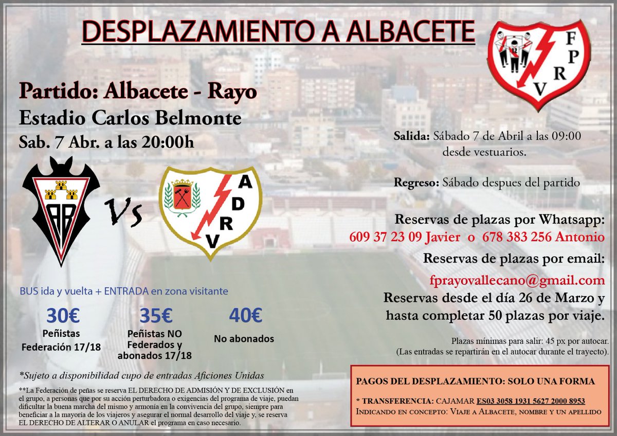 La afición del Rayo Vallecano ya prepara el desplazamiento más cercano de la temporada fuera de la Comunidad de Madrid: el viaje a Albacete para el encuentro del próximo sábado 7 de abril a las 20:00 horas.
