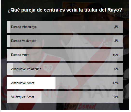 Es evidente que los aficionados franjirrojos quieren a Amat de titular, ya que la tercera más votada es la formada por Amat y Dorado (16% de los votos). Dorado-Ba, Dorado-Velázquez y Velázquez-Ba apenas consiguen representación.