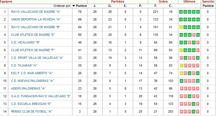 El equipo franjirrojo acabó en la tabla con 78 puntos terminando a 9 puntos del segundo y a 14 del tercer clasificado, el Rayo Benjamín B.