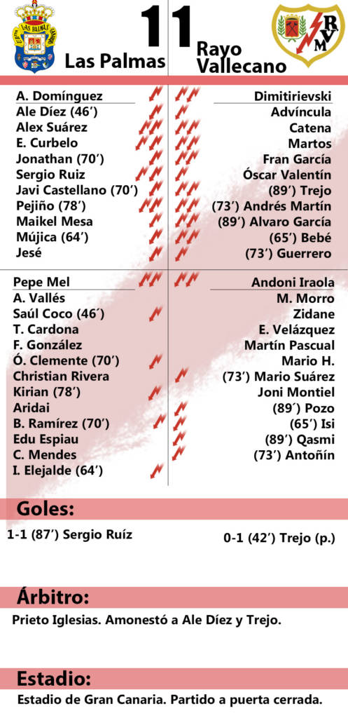 La segunda parte fue de los canarios, que acusaron el mismo problema que su rival: la falta de pegada. El Rayo tuvo dos clarísimas para sentenciar. La primera, de Andrés Martín… En fuera de juego. Definió a las mil maravillas ante Domínguez, pero partió en fuera de juego. La segunda, casi rozando el descuento en las botas de Álvaro García, que recogió un rechace y, a pesar de estar casi a puerta vacía, buscó un pase de la muerte y desperdició la jugada. La mirada que le echó Trejo, atónito, fue efectista.