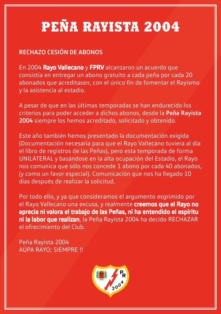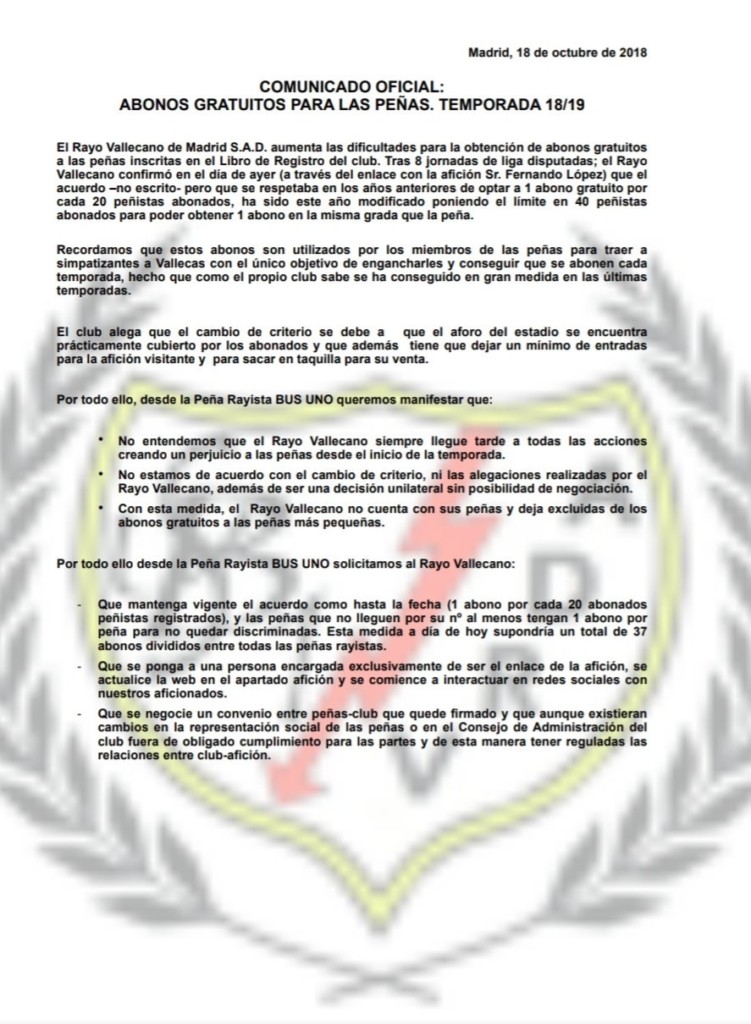 Por su parte, la Peña Rayista Bus Uno también ha querido mostrar su punto de vista al respecto y sacar su propio comunicado sobre la cesión de abonos por parte del Club: