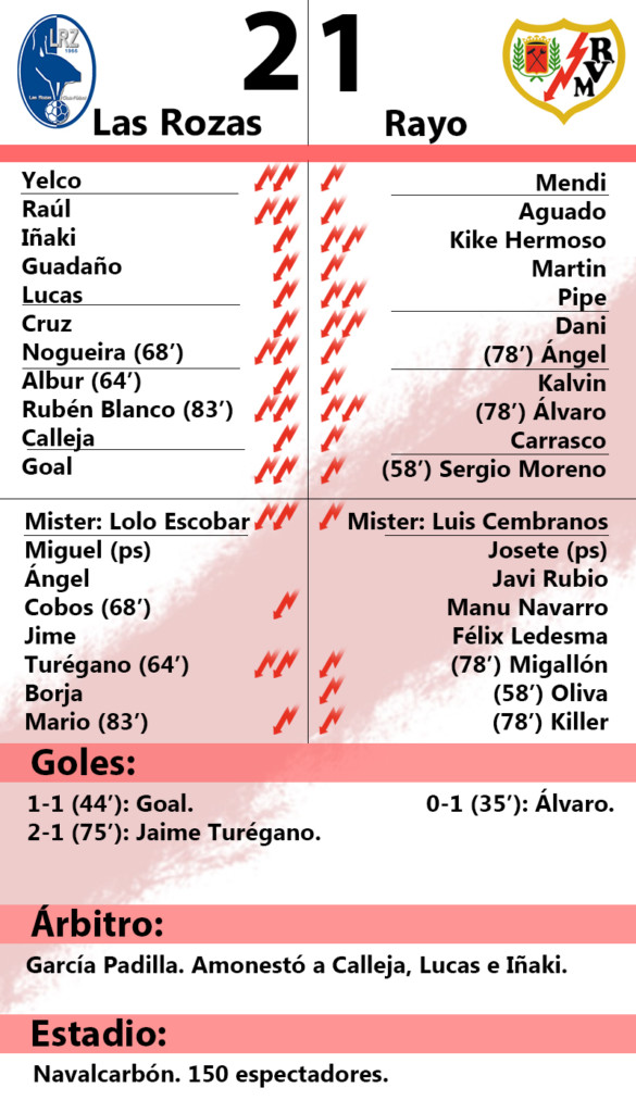 J22Nueva derrota del Rayo Vallecano B en Navalcarbón ante Las Rozas, que mantiene el liderato, en un partido que supone el sexto sin cosechar los tres puntos. Encuentro correspondiente a la vigésima segunda jornada del grupo VII de Tercera División.