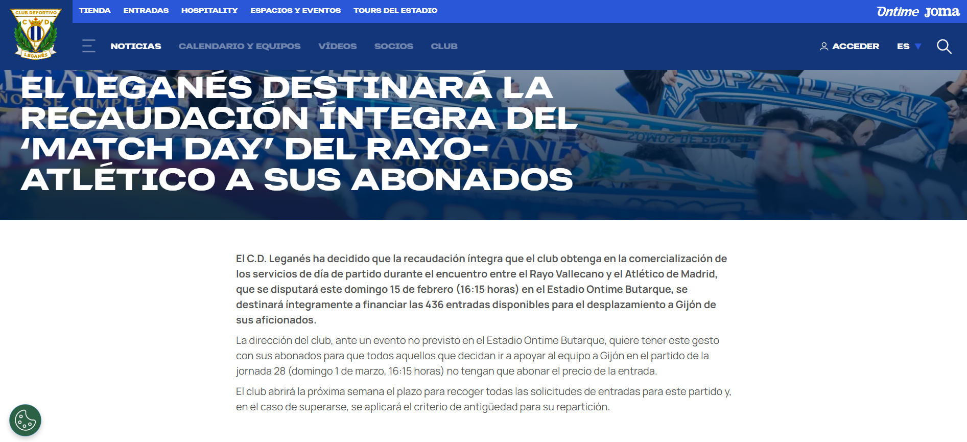 El C.D. Leganés ha decidido que la recaudación íntegra que el club obtenga en la comercialización de los servicios de día de partido durante el encuentro entre el Rayo Vallecano y el Atlético de Madrid, que se disputará este domingo 15 de febrero (16:15 horas) en el Estadio Ontime Butarque, se destinará íntegramente a financiar las 436 entradas disponibles para el desplazamiento a Gijón de sus aficionados.