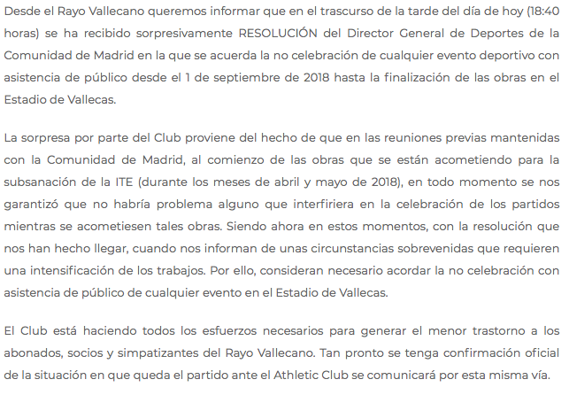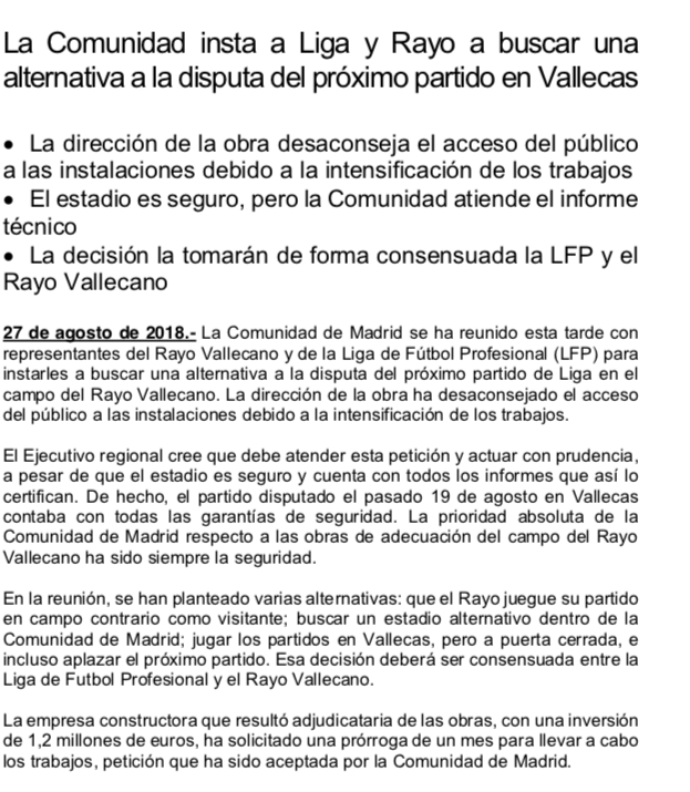 La Comunidad de Madrid lanzó un comunicado a última hora de la tarde explicando que habían instado a Liga y Rayo a buscar una alternativa a la disputa del Rayo-Athletic en Vallecas. Asimismo, confiesan que la dirección de la obra ha desaconsejado el acceso del público a las instalaciones debido a la intensificación de los trabajos.