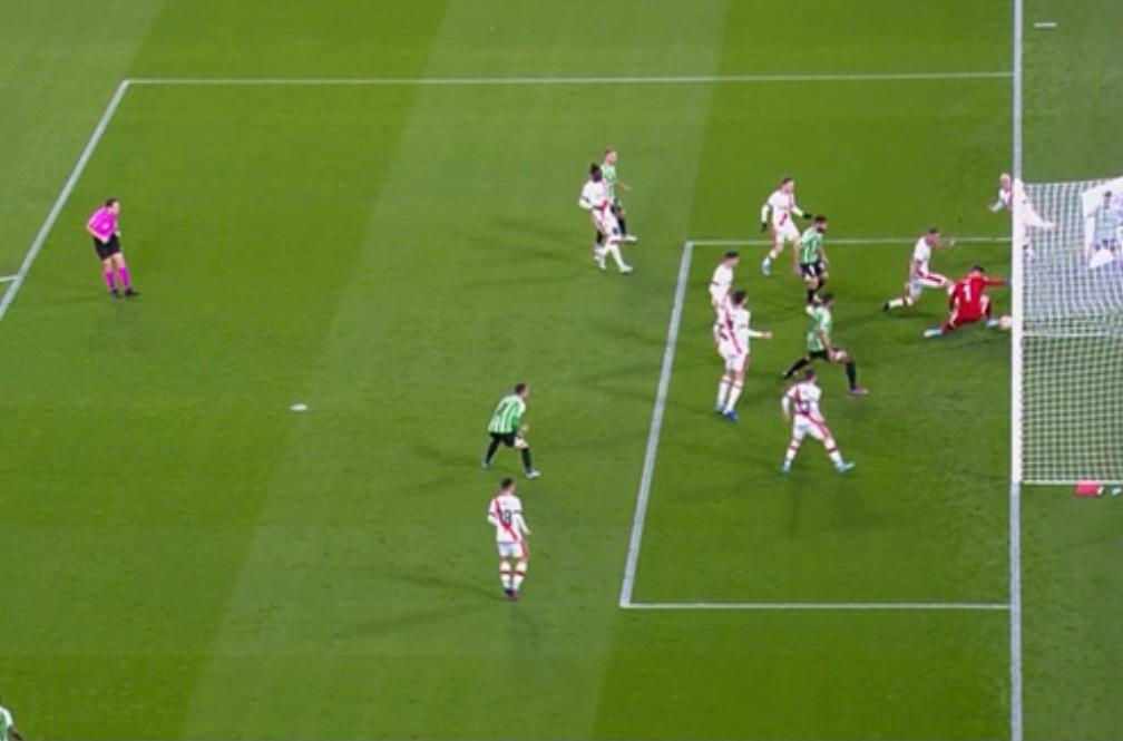 Álex Moreno se internaba en el área con mucho peligro esquivando todos los jugadores con camiseta blanca. El lateral intentaba el pase atrás y tras un mal rechace el balón se podía haber colado para hacer un gol que dificultase mucho más el pase para el Rayo Vallecano.