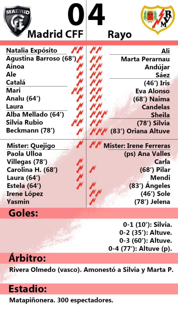 En la segunda mitad el Rayo supo interpretar mejor el partido y se sintió cómodo sobre el césped de Matapiñonera. Supo jugar con la ansiedad de las locales y cerró una gran goleada ante un poderoso rival con la exhibición de Altuve. La venezolana colocó el 0-3 tras una gran jugada de Sheila y, minutos después, transformó un penalti tras una mano de Ale dentro del área; finiquitando así el encuentro y logrando su primer hattrick en España. Un debut más que soñado.