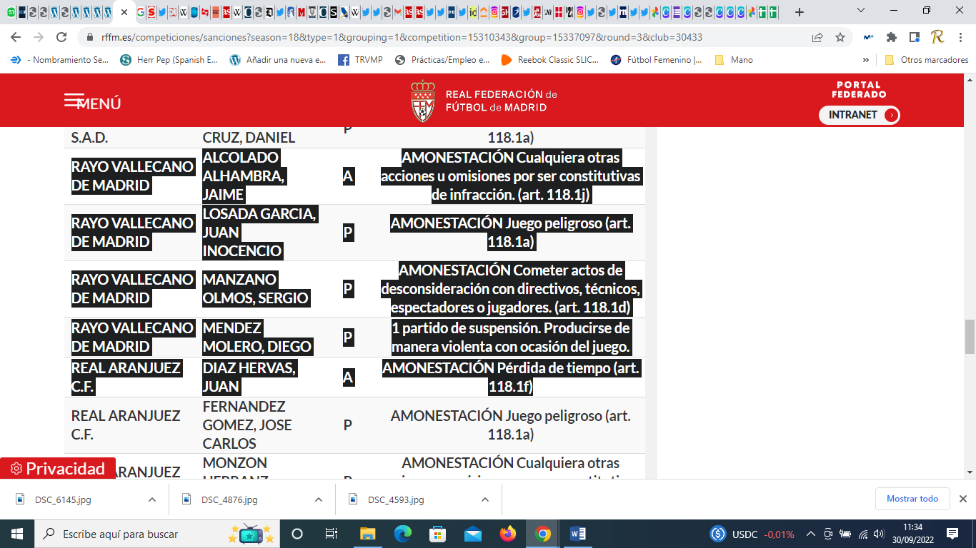 Tal y como se puede apreciar en la siguiente imagen de la Real Federación de Fútbol de Madrid, las diversas sanciones han sido: