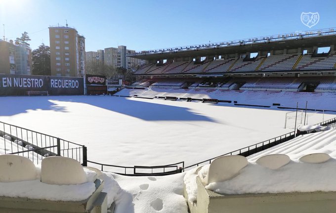 Las condiciones metereológicas de Madrid han provocado que el césped del Estadio de Vallecas esté completamente nevado. En este sentido, el Rayo fue previsor, al colocar una lona protectora. Sin embargo, las intensas nevadas han hecho inútil esta medida.