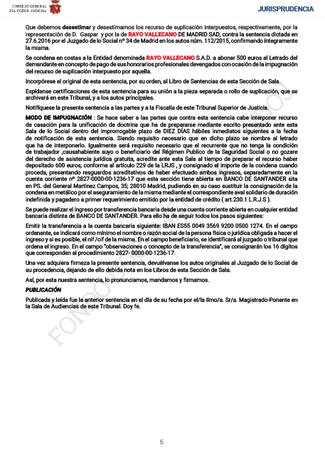 El Tribunal Superior ha desestimado el recurso, según ha filtrado la Asociación de Accionistas ADRV, por lo que se activa la obligación para el Rayo Vallecano de cotizar por Luis Yáñez a la Seguridad Social abonando las cuotas pertinentes atrasadas, ya sea por la relación laboral o por cuenta ajena. Este edicto se basa en la sentencia dictada en 27 de junio de 2016 por el Juzgado de lo Social nº 34 de Madrid.