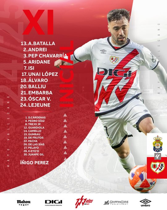 El once elegido por Íñigo Pérez está formado por: Batalla; Pep Chavarría, Lejeune, Aridane, Balliu; Unai López, Óscar Valentín, Ratiu, Isi, Embarba y Álvaro García.