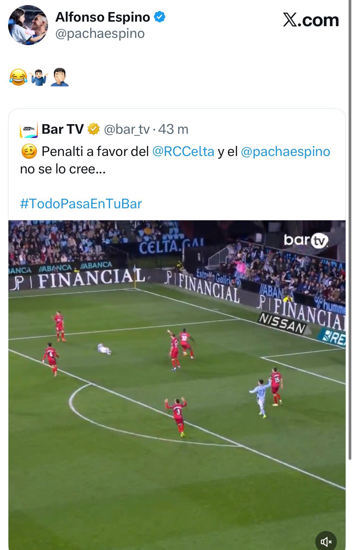 El Pacha reacciona en redes al penalti que le pitaron ante el Celta