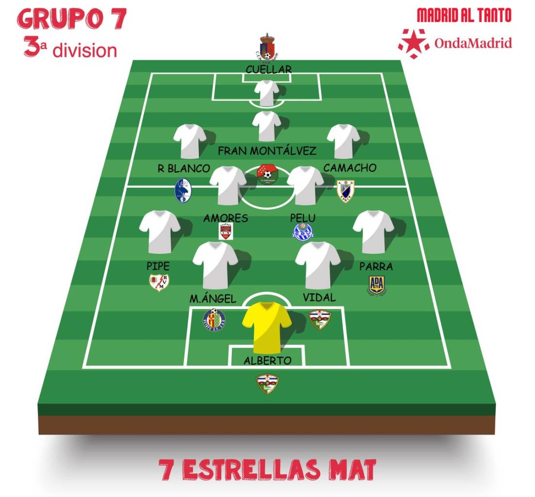 El once es el formado por Alberto (Trival); Parra (Alcorcón), Vidal (Trival), Miguel Ángel (Getafe B), Pipe (Rayo B); Iván Amores (Alcobendas Sport), Pelu (Vicálvaro); Camacho (Parla), Fran Montálvez (Móstoles), Rubén Blanco (Las Rozas) y Cuéllar (Pozuelo).