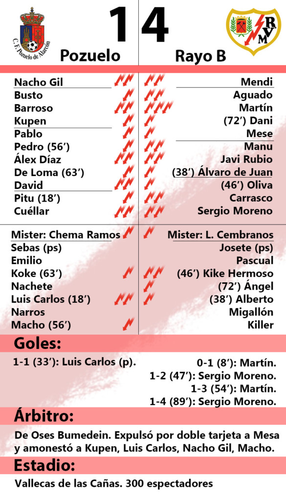 Victoria (1-4) del Rayo Vallecano B ante el Pozuelo en el Estadio Valle de las Cañas. Los goles de Martín y Sergio Moreno permiten al filial vallecano cosechar sus primeros tres puntos como visitante. Partido correspondiente a la sexta jornada del Grupo VII de Tercera División.