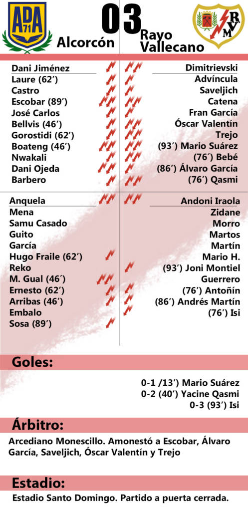 Hubo muy poco del Alcorcón en ataque, y absolutamente nada del Rayo. Los alfareros no se recuperaron del mazazo anímico que había supuesto el gol anulado y acabaron ahogándose en un tramo final monótono y frío. Fue una segunda parte verdaderamente sosa, pero eso, aunque levanta alergias en el espectador neutro, es lo correcto cuando vas ganando. Matar el ritmo, que no pasen cosas y, sin embargo, que sí pasen los minutos. Dimitrievski intervino para evitar un remate raso desde la frontal en el último cuarto de hora. Y poco más. Para que se hagan una idea, el Alcorcón acabó el partido con 1 sólo disparo a puerta, el que se acaba de citar. Y la puntilla la puso Isi, el más pequeño de la clase, con el 0-3 de cabeza. Ya era el 92′. Fue un triunfo plácido para el Air Force Rayo. Tres cabezazos y tres puntazos.