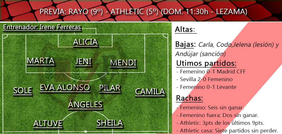 El Rayo Femenino se enfrentará mañana a partir de las 11:30 al Athletic Club en Lezama con la intención de poner fin a la mala racha de resultados. Los de Irene Ferreras acumulan seis partidos de liga consecutivos sin ganar, y aunque se encuentran siete puntos por encima de los puestos de descenso, necesitan volver a la senda de la victoria para no decaer puestos en la clasificación y entrar en problemas. Además, vienen de quedar eliminadas de la Copa de la Reina ante la Real Sociedad por un contundente 4-0.