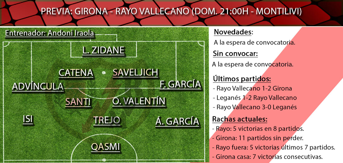 El envite es complicado, ya que el Girona es uno de los mejores equipos del tramo final de competición. De hecho, encadenan 11 partidos sin perder, y han hecho de Montilivi algo más que un fortín: siete victorias consecutivas. En esos siete encuentros ha anotado 14 goles y solo ha encajado dos. De hecho, no recibe gol en su Estadio desde el 3 de abril, lo que supone cinco partidos con la portería a cero. Todos estos datos denotan lo complicado que será para el Rayo.