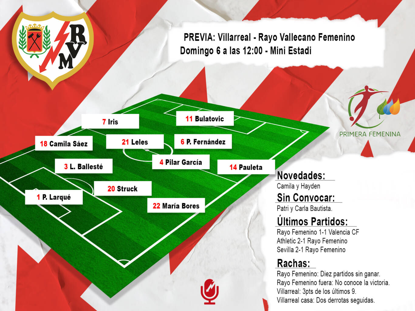 El Rayo Femenino viaja a Villarreal con una única opción: ganar. Las de Santiso necesitan conseguir los tres puntos tras sumar diez partidos consecutivos, tres meses, sin ganar en Liga, pero tras empatar frente al Valencia en casa (1-1). Quedan 12 partidos, 36 puntos en juego y esta semana es vital para sumar de tres en tres. Santiso tiene a toda la plantilla disponible excepto Patri Hidalgo y Carla Bautista. La colegiada del partido será Eugenia Gil Soriano.