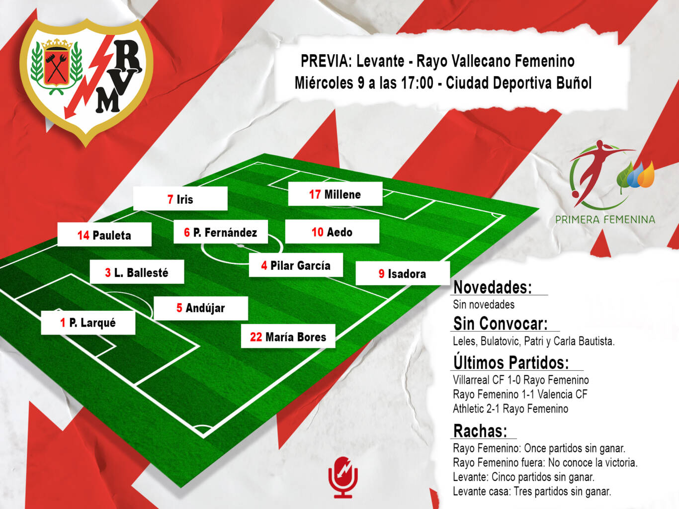 El partido del Rayo Femenino es importante porque es un partido aplazado y significaría recortar puntos que no tienen los rivales. Además, sería frente a un Levante que viene en un mal momento. El Rayo no gana en el campo del Levante desde la temporada 2017/18 con un (2-3). A partir de ahí, tres derrotas consecutivas, la última dolorosa (5-1). El balance total es de 3 victorias, 2 empates y 3 derrotas.