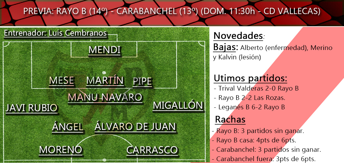 Por su parte, el Real C.D Carabanchel llega al partido con hambre de victoria tras caer derrotado (0-1) en la Mina ante el Atlético de Pinto. El equipo dirigido por Alberto Manzano se sitúa en decimotercera posición, con los mismos puntos que el Rayo B. Un duelo que servirá para que uno de los dos conjuntos pueda despegar hacia zonas más altas de la clasificación.