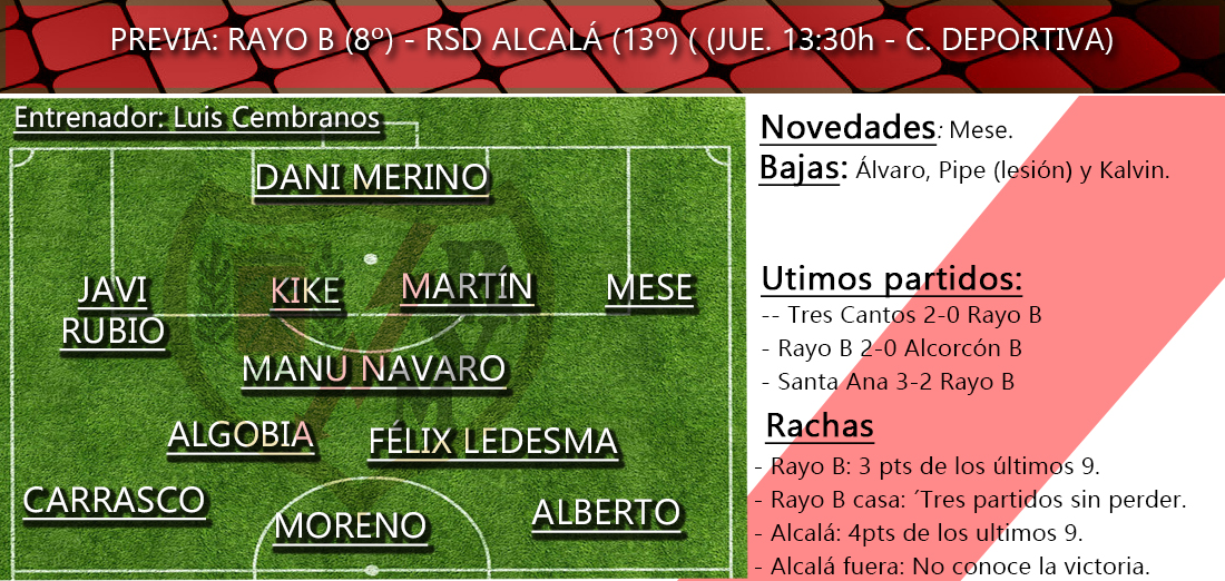 El Rayo Vallecano B recibirá a la Real Sociedad Deportiva Alcalá en la Ciudad Deportiva FRVM este jueves (13.30h) en un partido marcado por las cero victorias a domicilio del conjunto visitante. Encuentro perteneciente a la décimo sexta jornada del grupo VII de Tercera División.