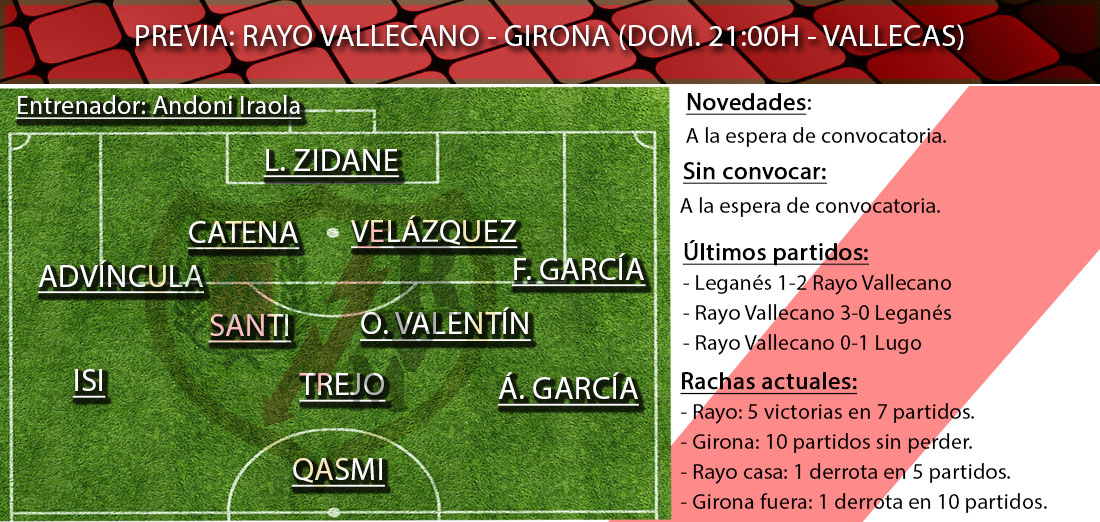 El reto no será nada sencillo, ya que el Girona se presenta en Vallecas con una dinámica que asusta. Su última derrota fue precisamente en el feudo franjirrojo en Liga (el 10 de abril), y desde entonces encadena ocho victorias y dos empates en los 10 partidos que ha disputado. Ese sprint le ha catapultado a disputar la final por el ascenso, y llega en su mejor momento del curso. No en vano solo han encajado dos goles en esos 10 partidos. Además, recuperan a su goleador, Christian Stuani, que pese a no haber podido disputar el grueso de la temporada, ya suma 10 goles con el Girona esta temporada.