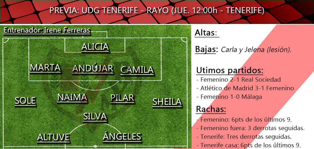 Rachas contrapuestas pero mismos puntos en la tabla, 16, y estadísticas prácticamente exactas: 14 goles a favor y 19 en contra para las vallecanas; 14 goles a favor y 20 en contra para las tinerfeñas. En frente, el Granadilla intentará defender su feudo tras una racha de 4 partidos seguidos sin ganar, aunque cabe destacar que han sido contra 4 rivales de los difíciles: Athletic, Levante (en Liga y en Copa) y Barcelona. A pesar de las diferentes rachas, como cada partido de esta Liga, casi con 100% de seguridad será un encuentro igualado y disputado.
