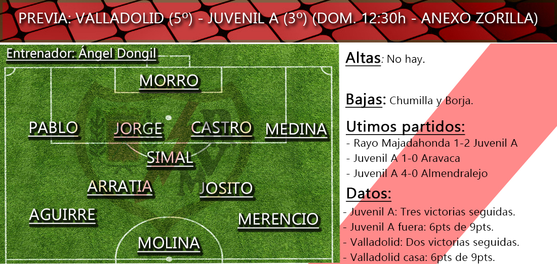 Llega uno de los rivales de altura, de esos que se colocan en el segundo escalón del Grupo V de División de Honor, siempre al acecho. El Rayo Vallecano Juvenil A viaja este domingo hasta Valladolid para enfrentarse al Pucela en el anexo al de Zorrilla (12.30 horas), y allí tratará de llevarse una victoria que daría un gran impulso anímico a los franjirrojos.