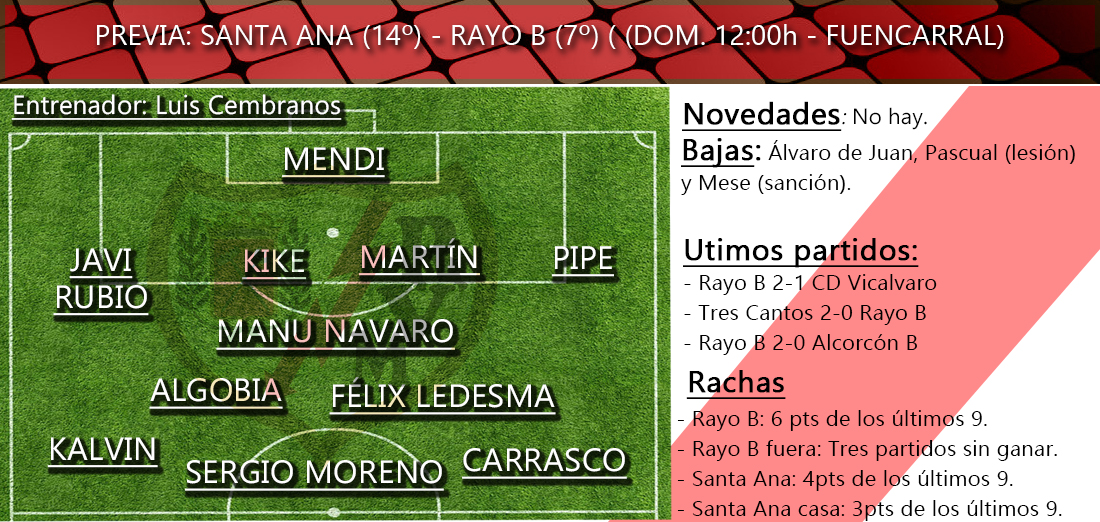 Tras lograr volver a la senda de la victoria (2-0) en un duelo de la parte alta de la tabla ante el Alcorcón B, el conjunto vallecano espera alargar la racha ante el Santa Ana. Situados en séptima posición con 22 puntos, los vallecanos se encuentran a tan solo cuatro de los puestos de play-off, por lo que una victoria acercaría a los de Cembranos al objetivo.