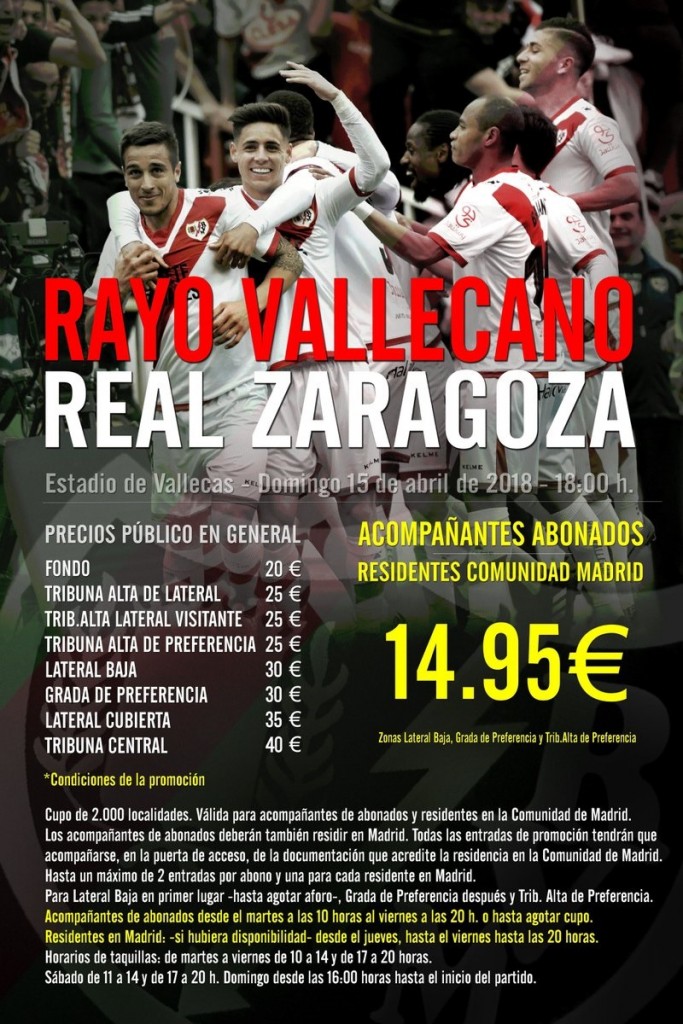 El Rayo Vallecano ha lanzado una promoción de 14,95 euros para las entradas del próximo compromiso liguero en el estadio de Vallecas ante el Real Zaragoza.