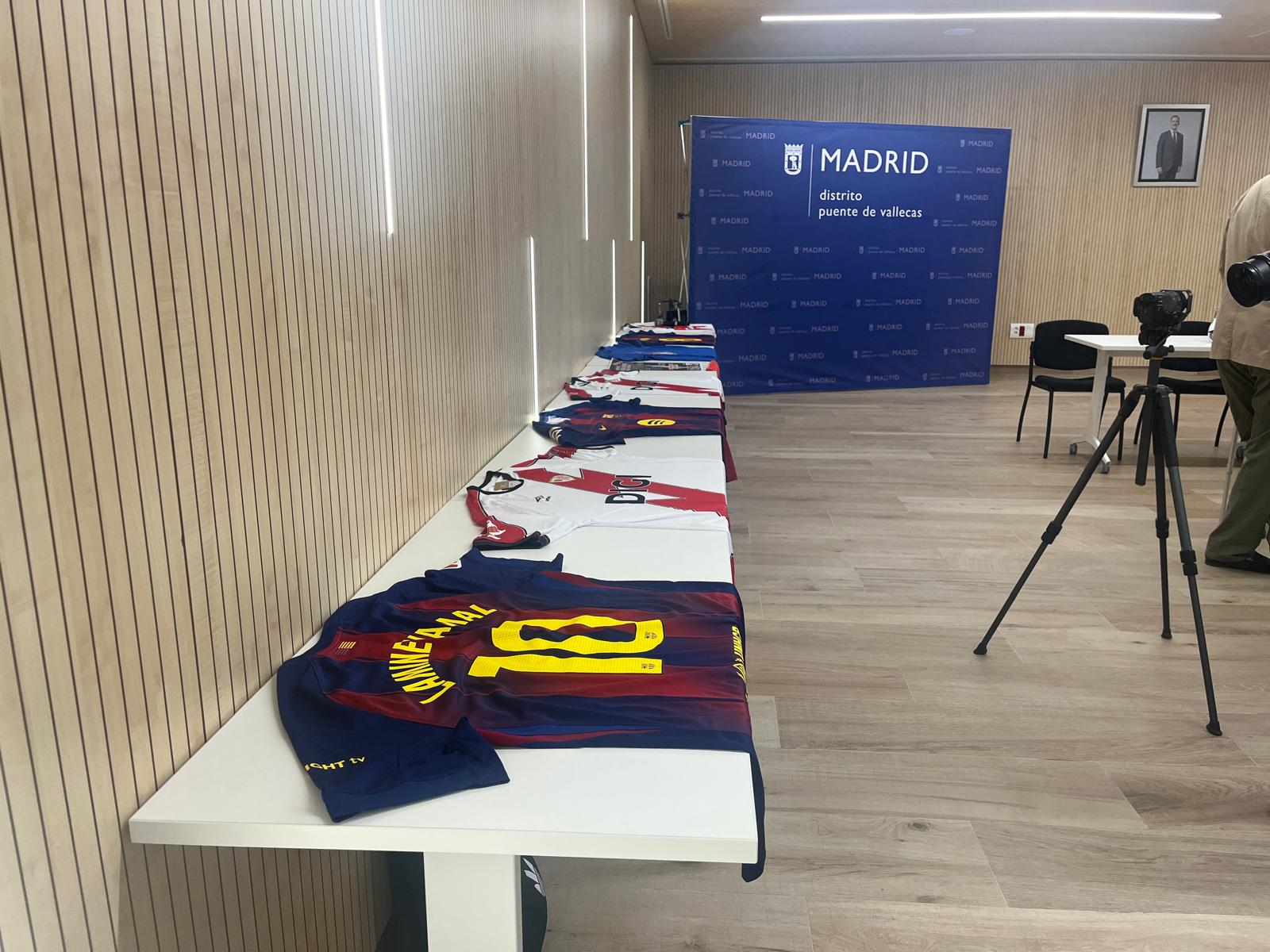 Javier Sierra agradeció en primer lugar al Rayo Vallecano por prestar tres camisetas de la primera indumentaria de juego, así como hizo lo mismo con Joan Laporta, que en el partido de LaLiga ante el Barcelona también entregó tres camisetas con los nombres de Lamine Yamal, Gavi y Pedri. También se entregarán camisetas del Real Madrid, Atlético de Madrid y la Real Federación Madrileña de Fútbol, así como el balón oficial del evento. Este material será firmado para posteriormente ser sorteado.