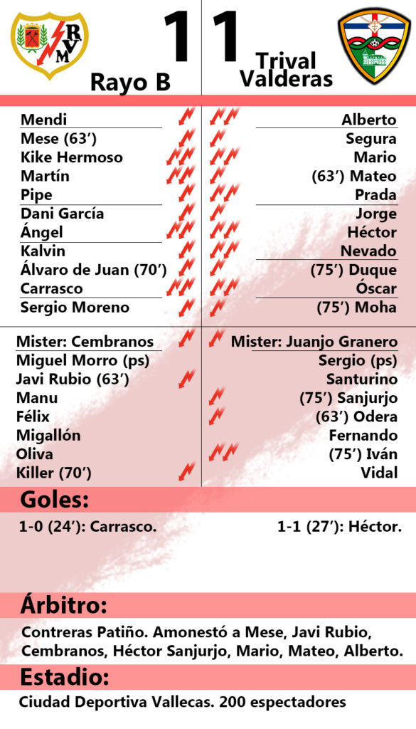 Empate del Rayo B ante el Trival Valderas (1-1) en la Ciudad Deportiva de Vallecas. Quinto partido sin ganar del filial franjirrojo, que se sitúa en mitad de tabla y se aleja de los puestos de playoff. El choque estuvo marcado por el intenso viento que azotó durante toda la mañana en un partido con poco fútbol: típico encuentro de Tercera División.