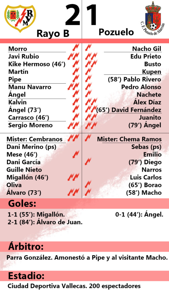 Sufrida pero necesaria victoria (2-1) del Rayo Vallecano B ante el Pozuelo gracias a los goles de Álvaro y Migallón en un partido que el filial tuvo que remontar. Encuentro correspondiente a la vigésima quinta jornada del grupo VII de Tercera División.