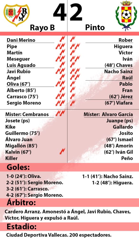 Victoria importante (4-2) del Rayo Vallecano B ante el Atlético de Pinto gracias a los goles de Sergio Moreno (x2), Oliva y Carrasco. Partido correspondiente a la vigésimo séptima jornada del grupo VII de Tercer División.