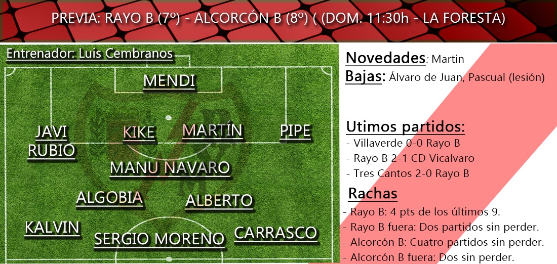 Por su parte, el Alcorcón B llega a Vallecas tras vencer (2-1) al Atlético de Pinto, consiguiendo su cuarto partido consecutivo sin conocer la derrota. El filial alfarero se sitúa en octava posición con 18 puntos, uno por debajo del Rayo B. El partido será especial para varios integrantes del conjunto alfarero como Mario Losada y el capitán Malote, ambos al volver a la que fue su casa.