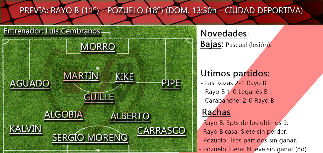 Por su parte, el Pozuelo no está viviendo una gran temporada y acumula tres partidos consecutivos sin conocer la victoria. Además, la situación fuera de casa es crítica pues el equipo dirigido por José María Ramos acumula nueve partidos sin conocer la victoria como visitante, situándose en décimo octava posición con 19 puntos, por lo que tendrá un gran reto ante el Rayo Vallecano B.