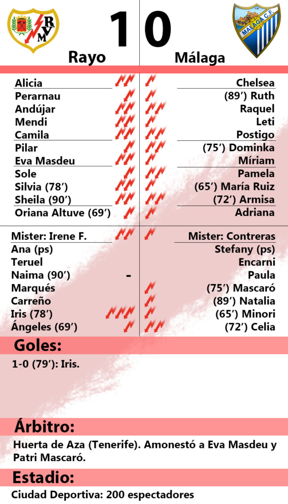 De nuevo el Rayo Femenino defendió su ‘fortín’. Van 4 victorias consecutivas en la Liga Iberdrola en Vallecas. De nuevo victoria trabajada y de nuevo por la mínima. Da gusto ganar cuando se juega bien y se golea… y cuando se sufre y te dominan a veces es más satisfactorio aún. El gol de Iris Ponciano a 10 minutos del final decantó un partido de esos difíciles, de máxima igualdad, que las rayistas cimentaron en el orden defensivo y en aprovechar los buenos tramos de fútbol que tienen en cada partido. Porque estas chicas saben jugar. Esta vez ante un Málaga que dominó pero no acabó de hacer efectivo su control del juego. Tres puntos claves ante un rival directo que hasta antes del choque tenían los mismos puntos que las vallecanas.