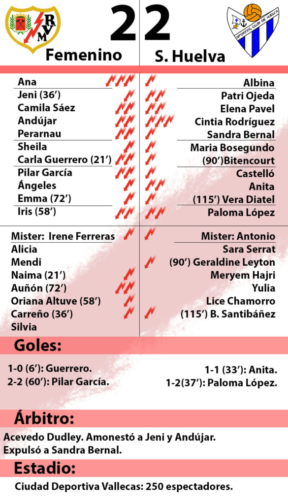 La Copa ilusiona y gusta mucho al conjunto vallecano. Barcelona y Atlético parecen inalcanzables en Liga lo que aumenta la importancia y el atractivo de la competición copera, ya que es el único título posible de la temporada. Salieron las chicas muy conscientes de ello, metidas en el partido. Con rotaciones esperadas tras el desgaste el pasado jueves en el choque ante el Atlético, jugadoras menos habituales como Marta Perarnau, Jeni, Emma Marqués o la guardameta Ana Valles tuvieron su oportunidad desde el inicio. De titular de nuevo oportunidad para Ángeles, que peleó durante los 120 minutos pero no estuvo acertada arriba. El arranque fue el idóneo y pronto se adelantaron en el marcador, gracias al primer tanto de Carla Guerrero como rayista al aprovechar un balón a la espalda de la defensa onubense. La mala noticia es que minutos después tuvo que retirarse del campo lesionada y en su lugar entró Naima.