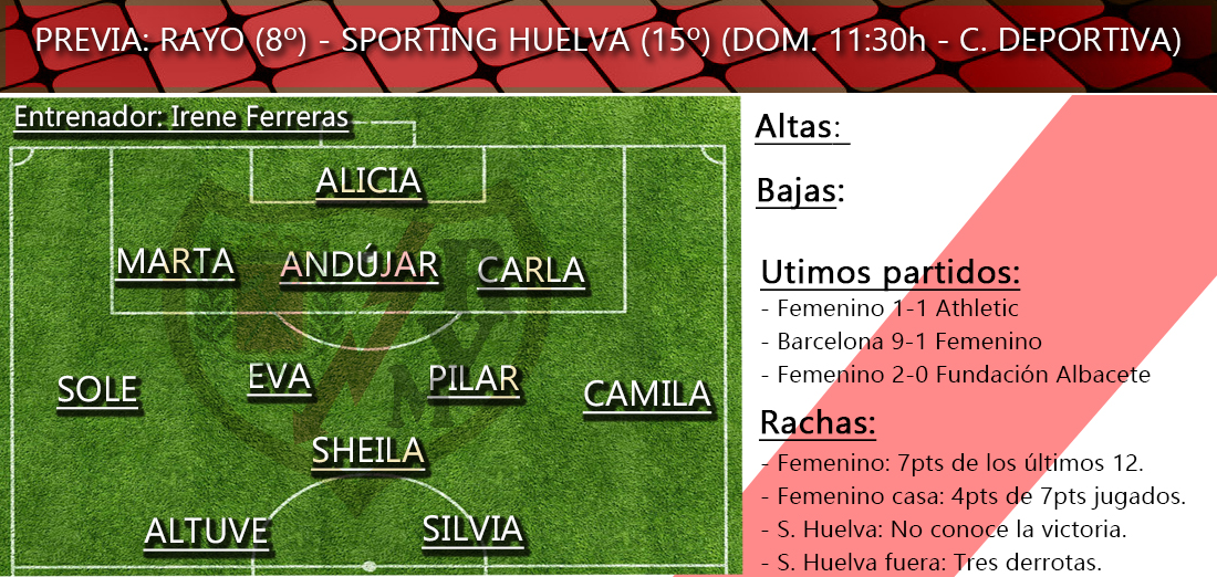 El equipo de Antonio Toledo llega el duelo en Vallecas muy necesitado. El conjunto onubense aún no conoce la victoria en lo que llevamos de competición. De esta forma las rayistas parten como favoritas; sin duda un partido trampa para las de Ferreras ya que el Sporting es un equipo consolidado en LaLiga Iberdrola.