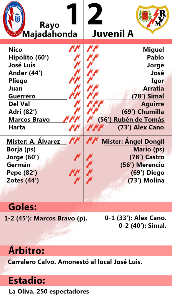 La superioridad rayista era clara, pero en una jugada individual del extremo majariego Marcos Bravo (el mejor de los suyos) Jorge cometía penalti claro. El propio Marcos lo transformó engañando a Miguel Morro y metiendo de lleno en el encuentro a los suyos junto antes del descanso.