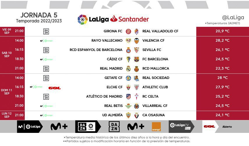La Liga ha dado a conocer el horario correspondiente a la jornada 4 de LaLiga en Primera División. De este modo, el Rayo Vallecano se medirá al Valencia en El Estadio de Vallecas el próximo sábado 10 de septiembre de 2022 a las 14:00 horas.