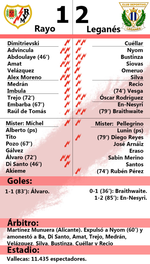 Cuatro partidos oficiales ha jugado el Rayo Vallecano frente al Leganés esta temporada. Tres derrotas y un empate es el bagaje. Este lunes, la bestia negra de los franjirrojos volvió a aparecer. Ni contr diez pudieron los de Míchel. Dos tantos tras sendos saques de esquina (Braithwaite y En Nesyri) hicieron caer al Rayo a la lona. El tanto rayista lo puso Álvaro García.