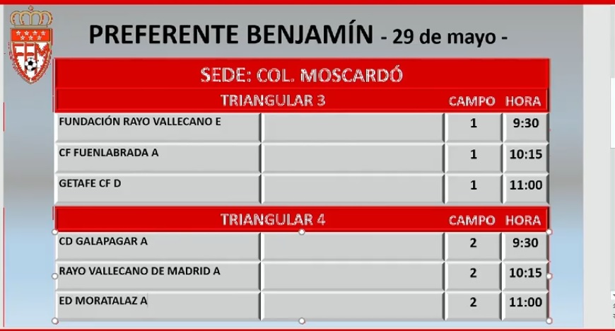 El Rayo Vallecano Benjamín A jugará finalmente el ‘Torneo de Cotorruelo’ o lo que es lo mismo el ‘Torneo de Campeones de la RFFM’ que disputan todos los equipos campeones de Preferente Benjamín.
