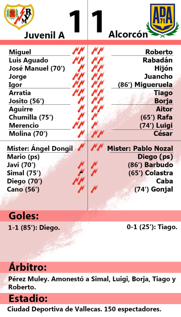 Era un partido para redimirse. Para levantarse de la derrota frente al Atlético de Madrid… pero no pudo ser. El Alcorcón dio la sorpresa en Vallecas al empatar al Rayo Juvenil A por 1-1 con un gol de Tiago paralos visitantes y otro de Diego para los locales.