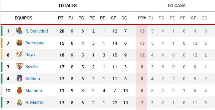 Real Sociedad y Barcelona acumulan un punto más (13) como local; aunque tanto donostiarras como catalanes han jugado un partido más y en este caso han sumado un empate.